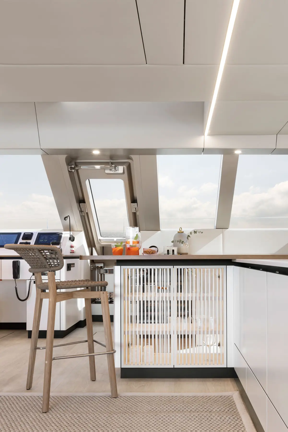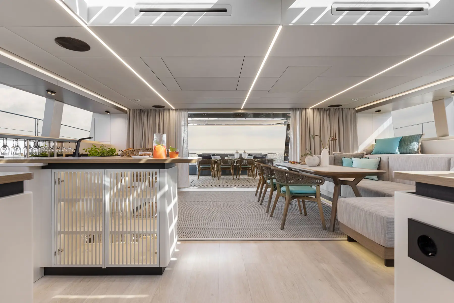 Der 60 Sunreef Power ist ein moderner, individualisierbarer Motorkatamaran. Angetrieben von elektrischen Motoren bietet die Yacht außergewöhnlichen Komfort und höchste Seetauglichkeit. Sie verfügt über einen geräumigen halb-offenen Salon, eine große Bugterrasse und ein Achtercockpit mit Sonnenbereichen. Die Flybridge umfasst auf Wunsch einen Spa-Pool, eine Bar, einen Essbereich und Sonnenliegen. Dieses Modell ist auch als umweltfreundliche 60 Sunreef Power Eco erhältlich.