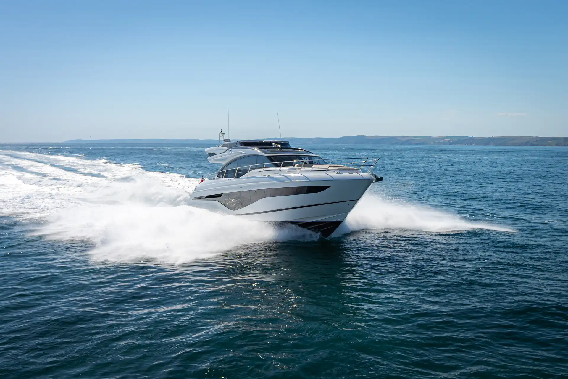 Kraftvoll und dennoch elegant – die neue Princess S62 ist unverkennbar Teil der S-Klasse. Ihr markantes Außendesign mit Glaselementen im Rumpf verleiht ihr einen dynamischen Auftritt. Dank optimierter Rumpfform erreicht sie hohe Effizienz und bis zu 38 Knoten Geschwindigkeit.