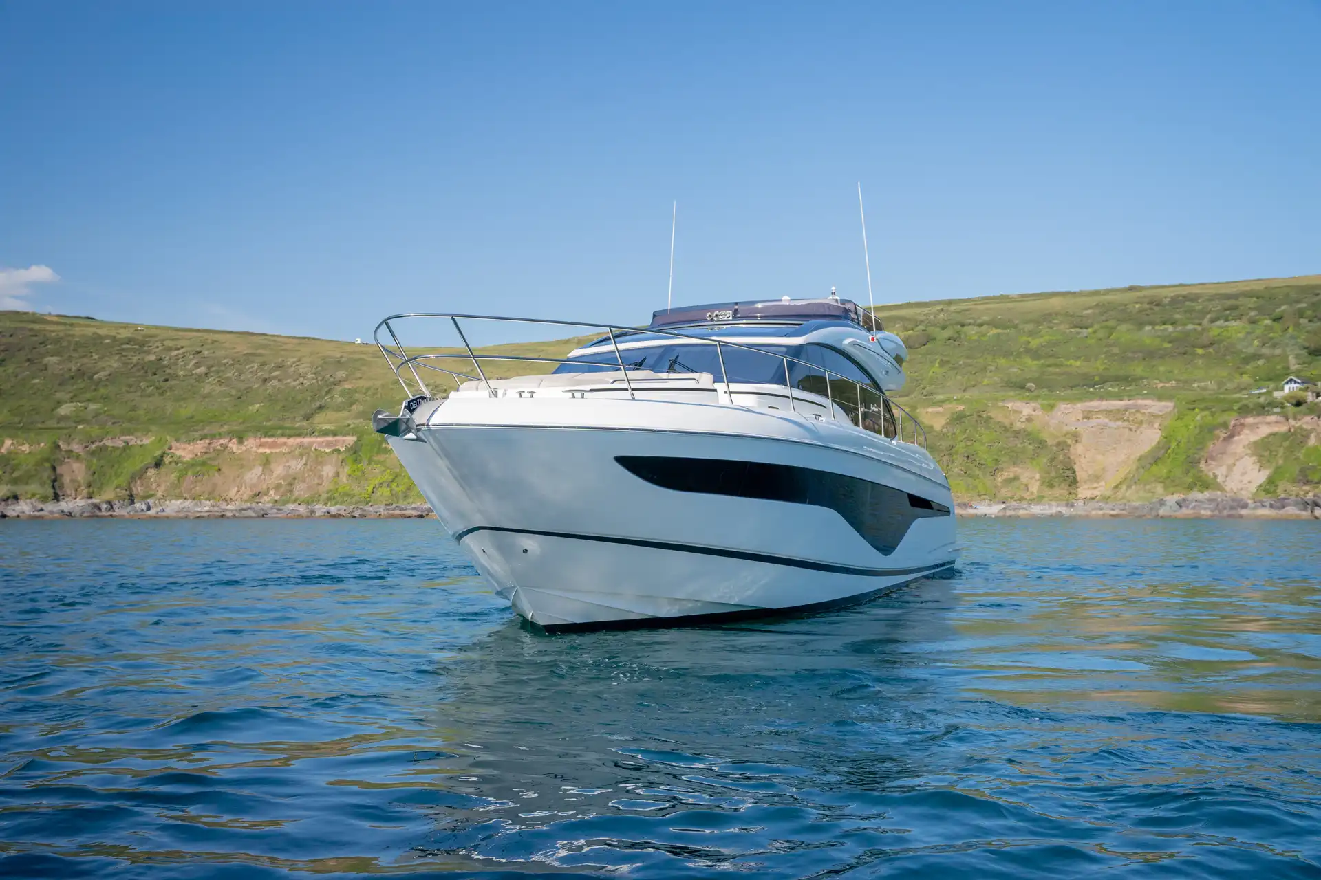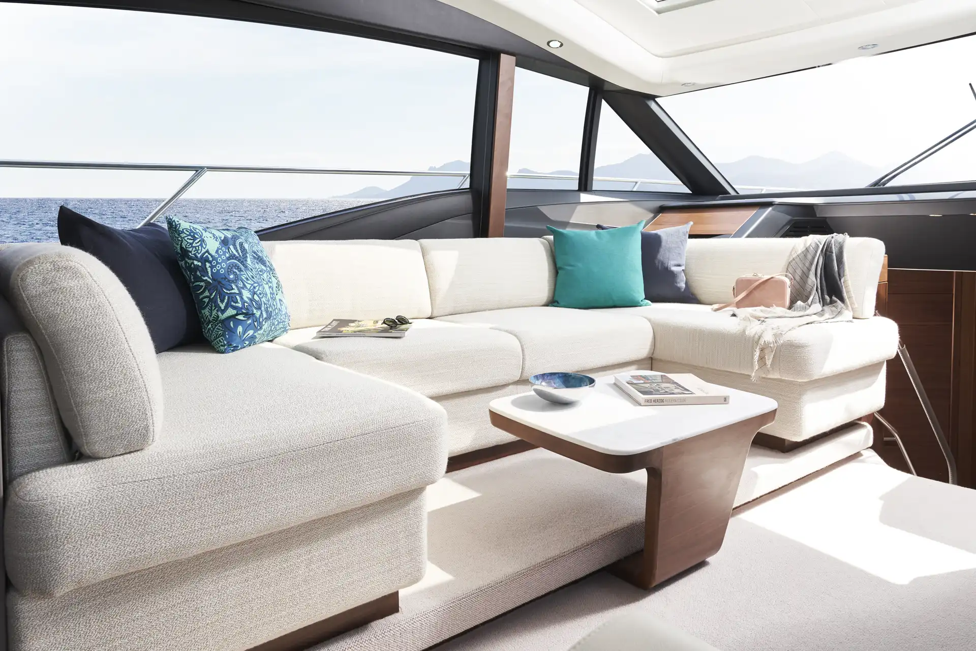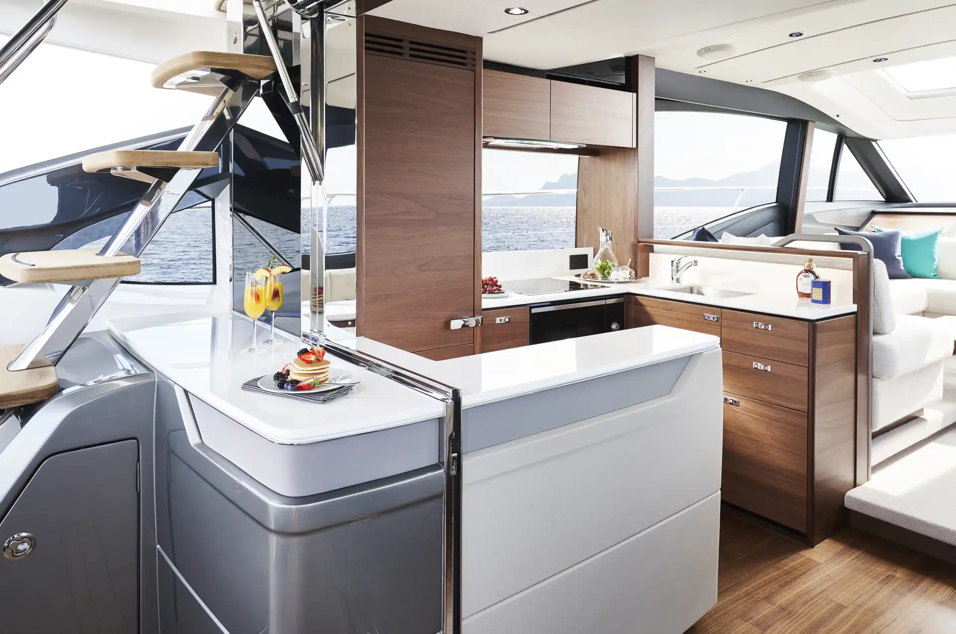 Vor Anker laden großzügige Decksflächen, etwa der Sonnenbereich am Bug, zum Entspannen ein. Am Heck ermöglicht die große Garage ein schnelles Ein- und Auswassern von Beiboot oder Jetski. Das Hauptdeck bietet eine offene Kombüse mit Essbereich, nahtlos verbunden mit dem Cockpit durch große Schiebetüren und ein komplett zu öffnendes Fenster.