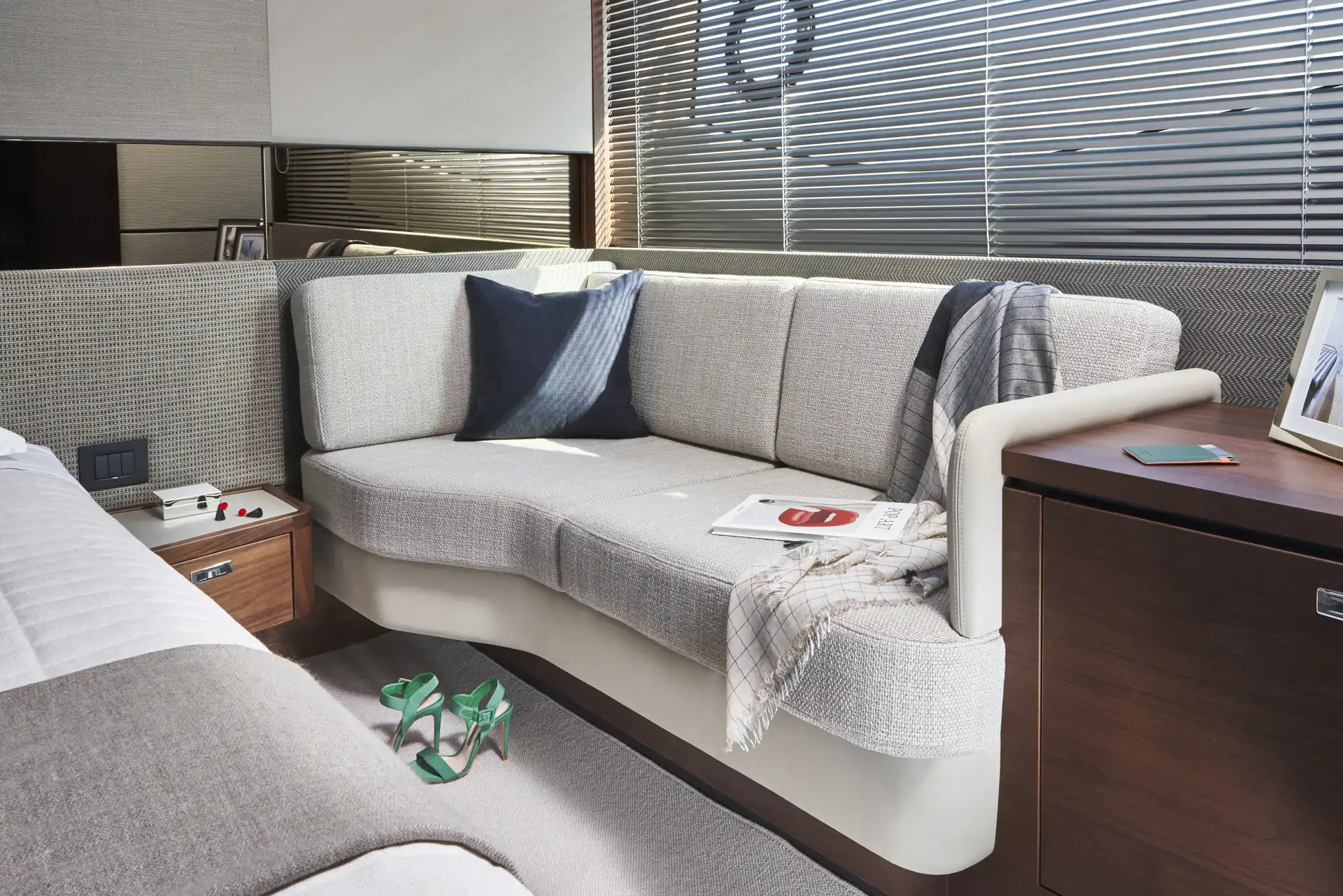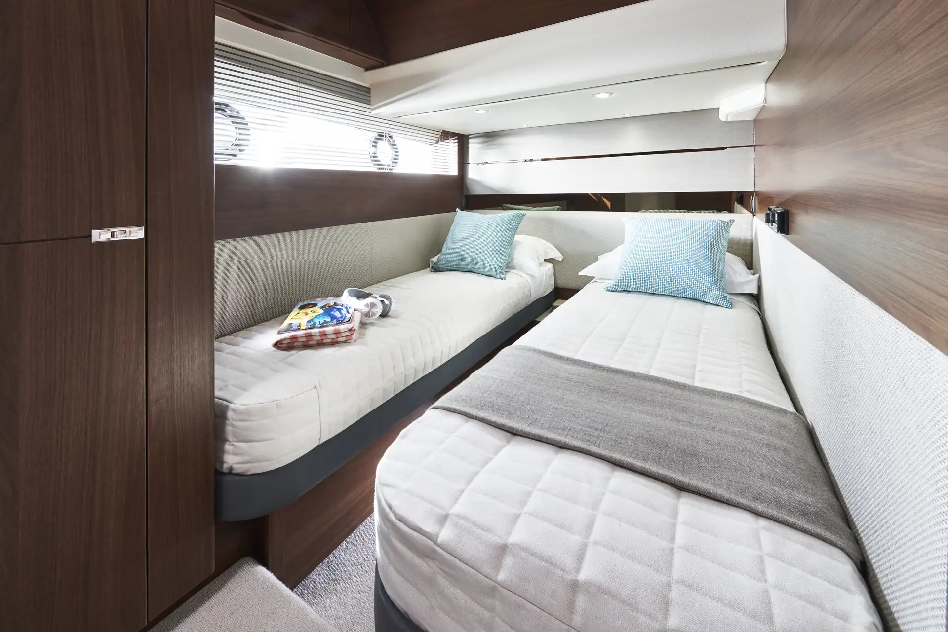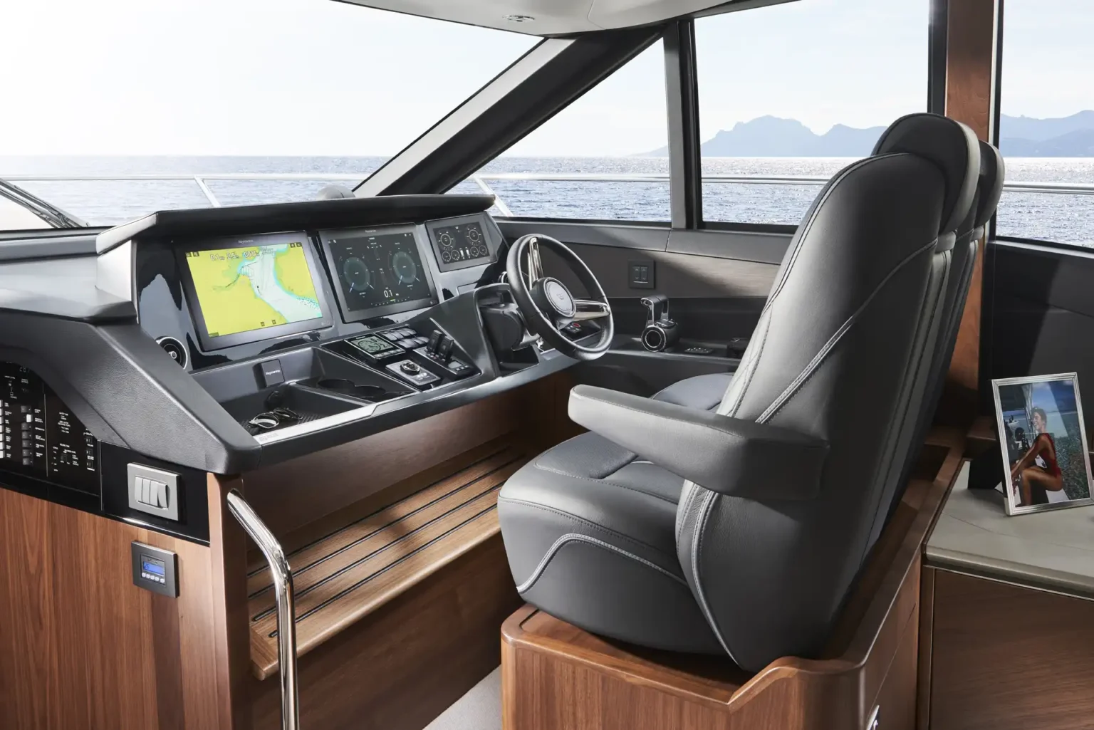 Vor Anker laden großzügige Decksflächen, etwa der Sonnenbereich am Bug, zum Entspannen ein. Am Heck ermöglicht die große Garage ein schnelles Ein- und Auswassern von Beiboot oder Jetski. Das Hauptdeck bietet eine offene Kombüse mit Essbereich, nahtlos verbunden mit dem Cockpit durch große Schiebetüren und ein komplett zu öffnendes Fenster.