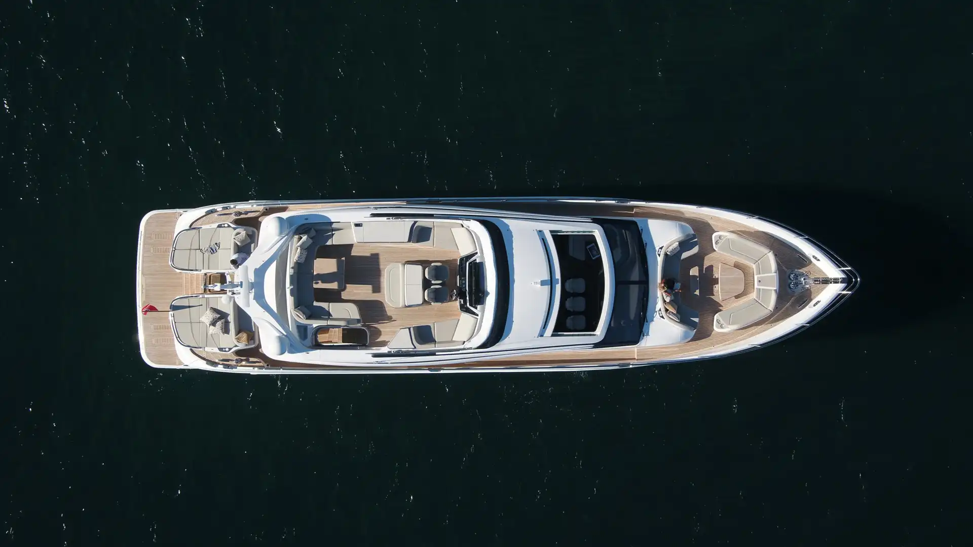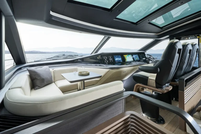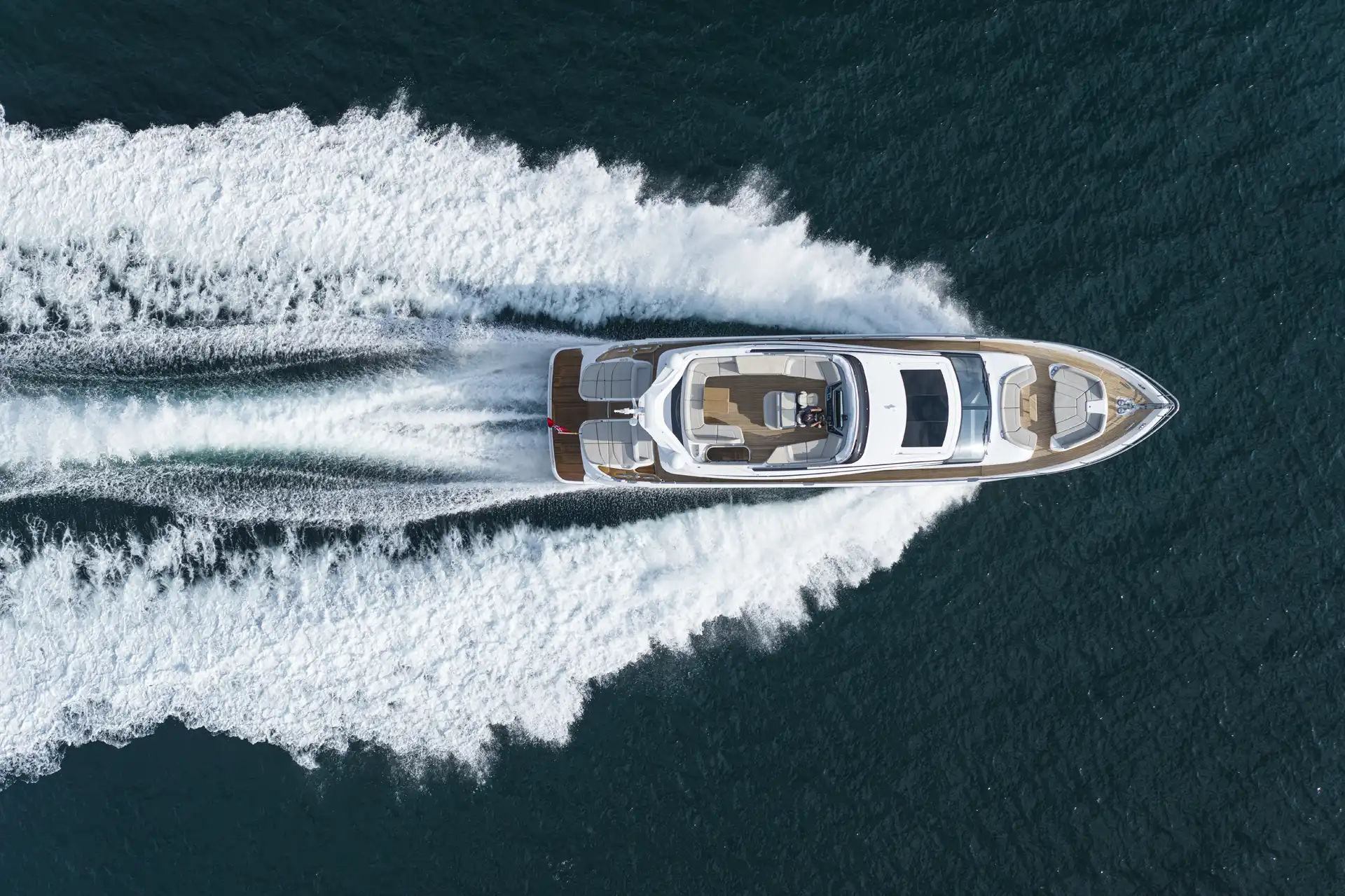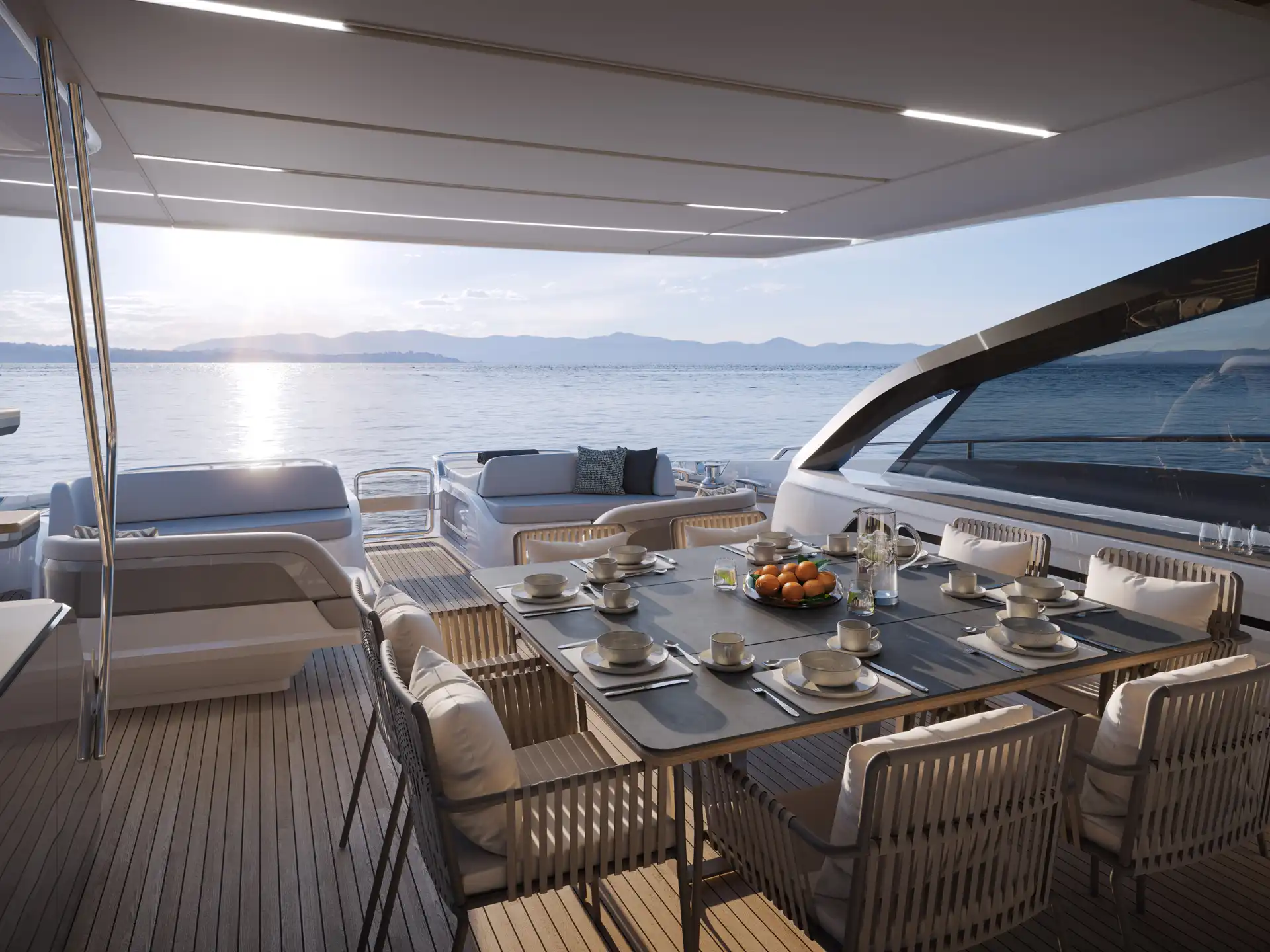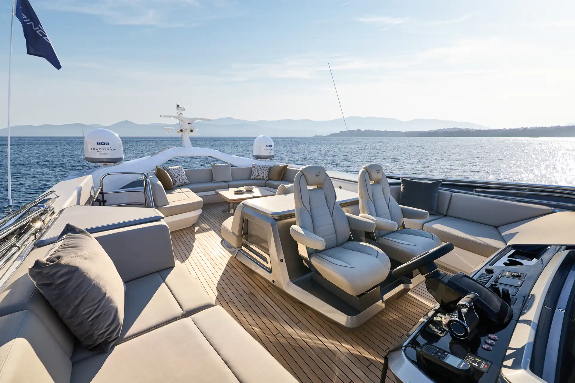 Mit ihrer entspannten Designsprache, exklusiven Ausstattung und einer Höchstgeschwindigkeit von 33 Knoten ist die neue Princess S80 das eindrucksvolle Flaggschiff der S Class. Die Sportbridge bietet individuell gestaltbare Sitz- und Liegeflächen, ideal zum Entspannen.