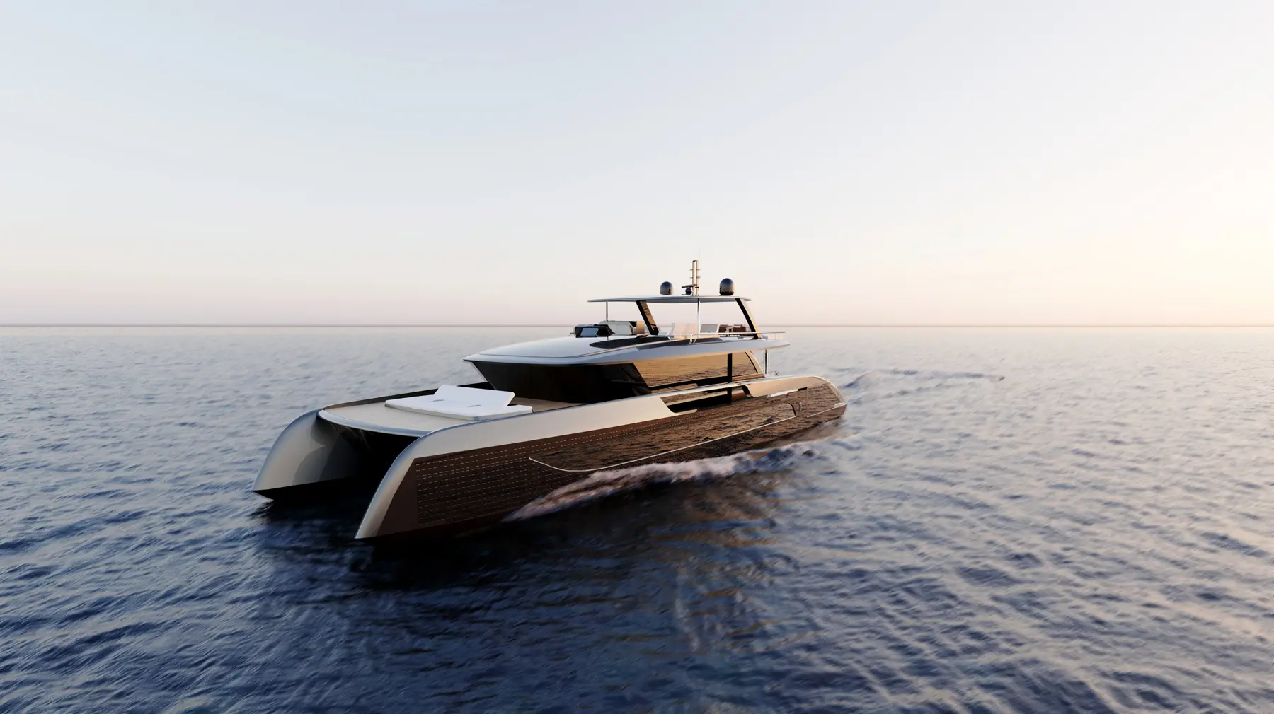 Seitenansicht der Sunreef 88 Ultima, die bei ruhigem Wasser entlang der Küste fährt, zeigt ihre glatte, futuristische Form.